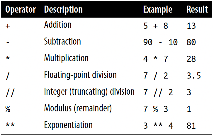 • Here is a table of the math operators:
